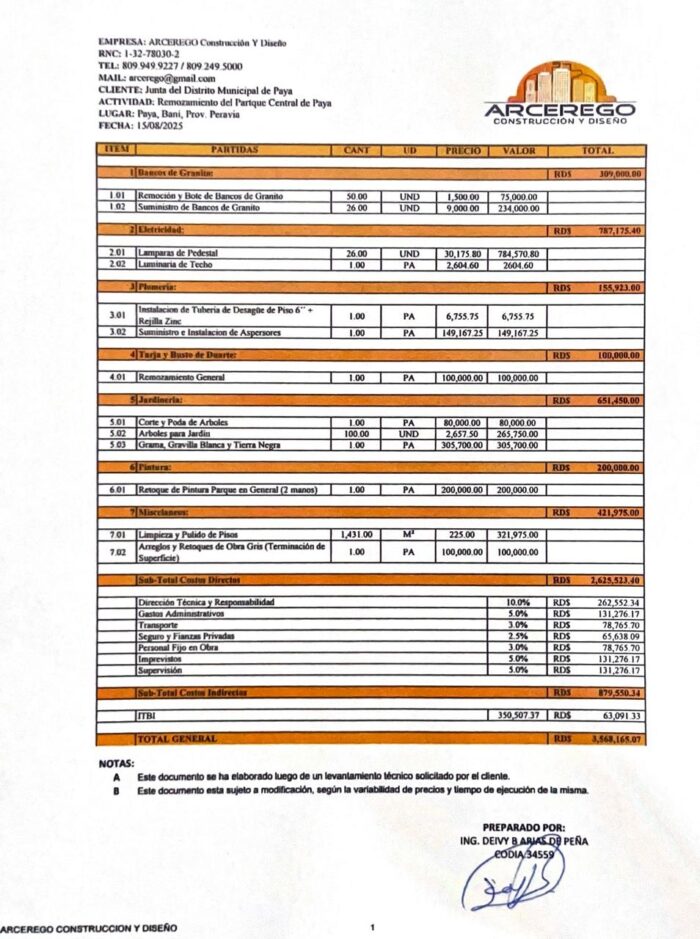 La Junta Municipal del Distrito de Paya, realizara el Remozamiento del Parque Principal del Distrito Municipal, obra estimada para su ejecucion del Presupuesto correspondiente al año 2025 y que el proximo 29 de Septiembre se iniciaran los trabajos de ejecucion de la misma.